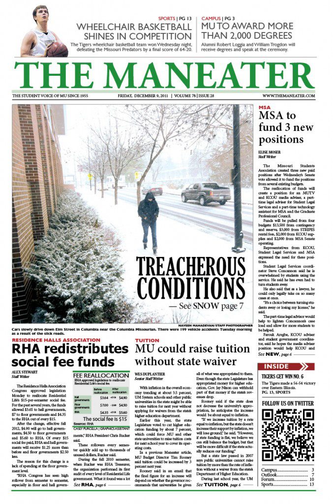 From Aug. 2011 - May 2012 I worked as the Production Manager at the twice-weekly student publication at Mizzou, the Maneater. I was responsible for the entire layout and design process from template creation and ad placement all the way to creating PDFs and sending them via FTP to the Sedalia Democrat Press. These are several cover pages, news pages, feature pages and spreads that I created while working for the Maneater.